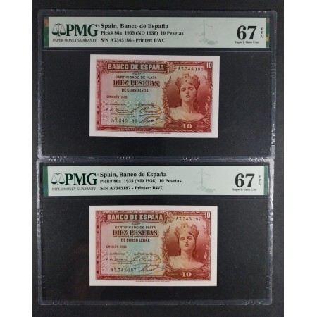 PMG BILLETES 1 PESETA 1940 SIN SERIE PAREJA EL CABALLITO O HERNÁN CORTÉS PMG 65-65 EPQ SIN CIRCULAR 325,00 €