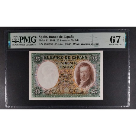 PMG 100 PESETAS 1931 CÓRDOBA PAREJA (EL GRAN CAPITÁN) PMG 67/67 EPQ SIN CIRCULAR CERTIFICADO 375,00 €