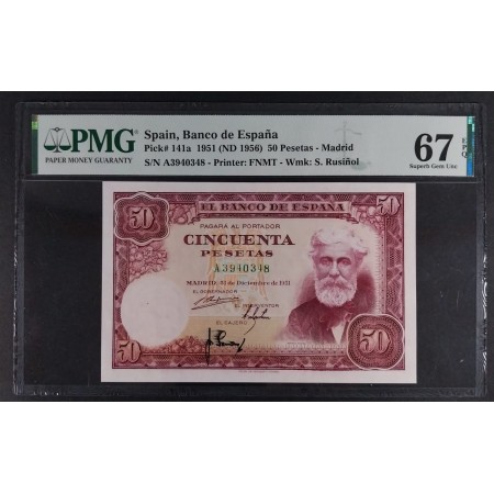 BILLETE 50 PESETAS 1951 SERIE A RUSIÑOL PMG 67 EPQ POP TOP SC