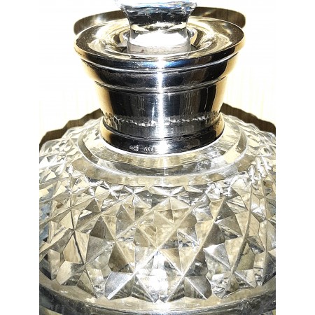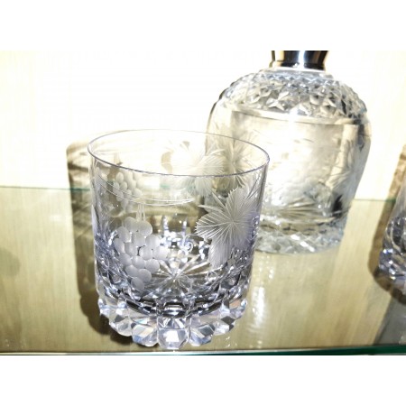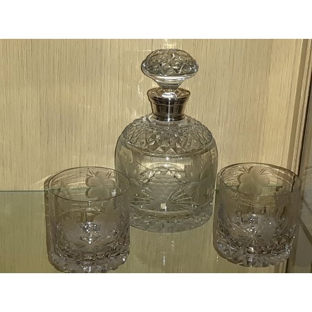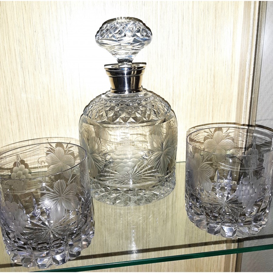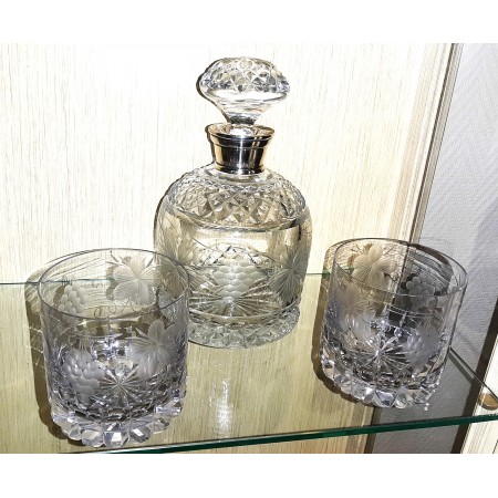 LICORERA DE CRISTAL TALLADO AL ACIDO RACIMOS DE UVA Y HOJAS DE VID CUELLO PLATA 2 VASOS
