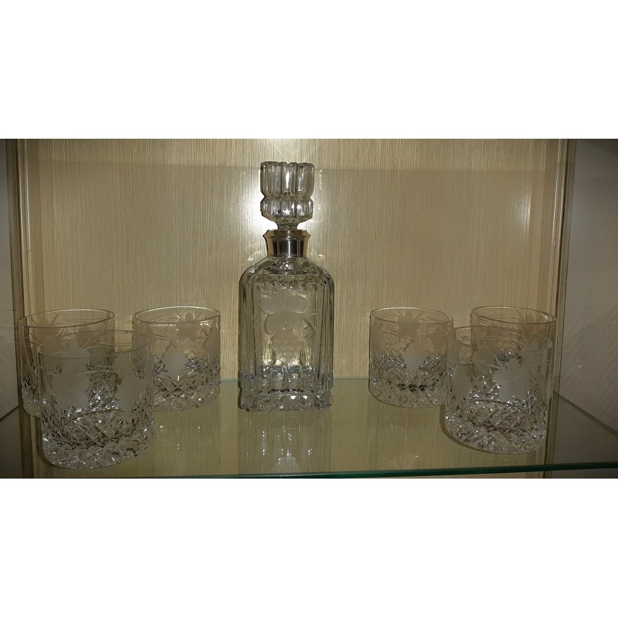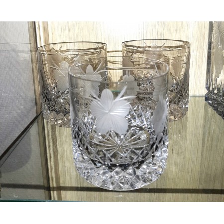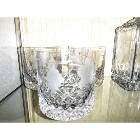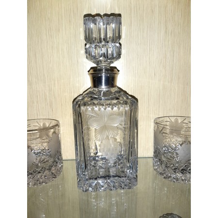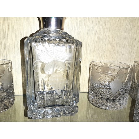 LICORERA ANTIGUA DE CRISTAL TALLADA AL ACIDO CON RACIMOS DE UVA Y HOJAS DE VID CON 6 VASOS.