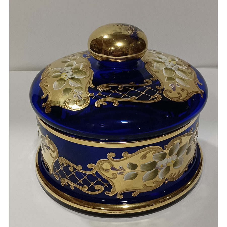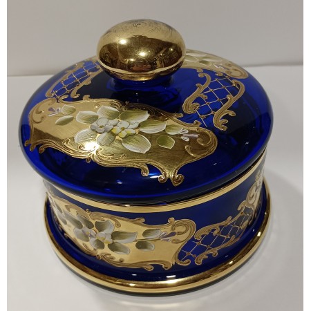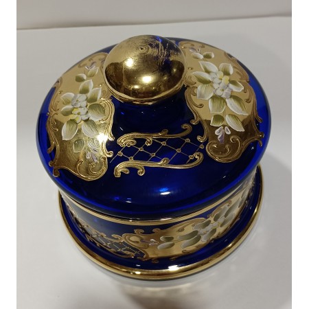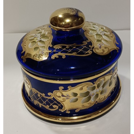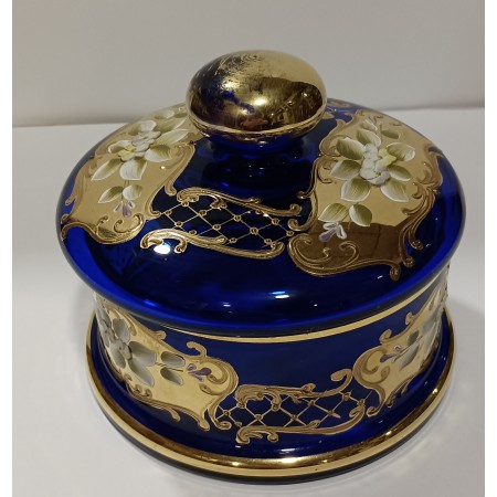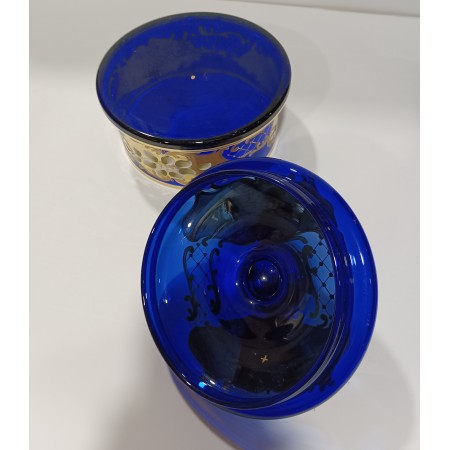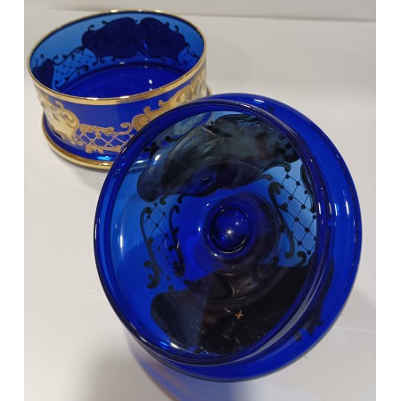 CAJA DE VIDRIO AZUL COBALTO CON PINTURAS ESMALTADAS DORADAS Ppios s.xx