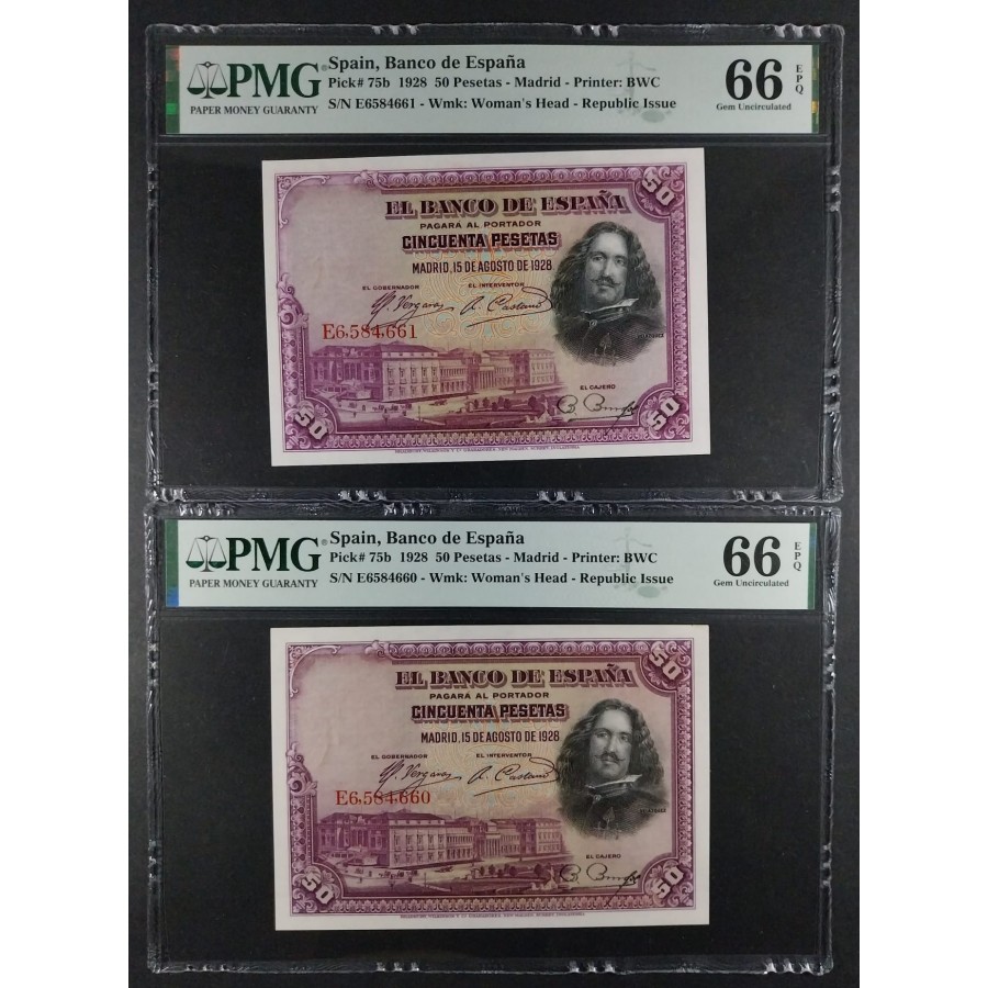 PMG 50 PESETAS 1928 VELAZQUEZ PMG 66/66 EPQ SERIE E PAREJA CORRELATIVA CERTIFICADO SIN CIRCULAR