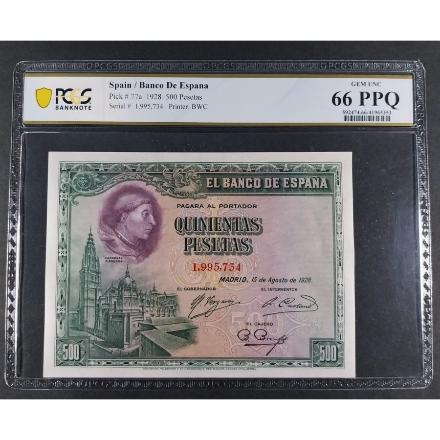 500 PESETAS 1928 CARDENAL CISNEROS PCGS 66 PPQ SIN CIRCULAR