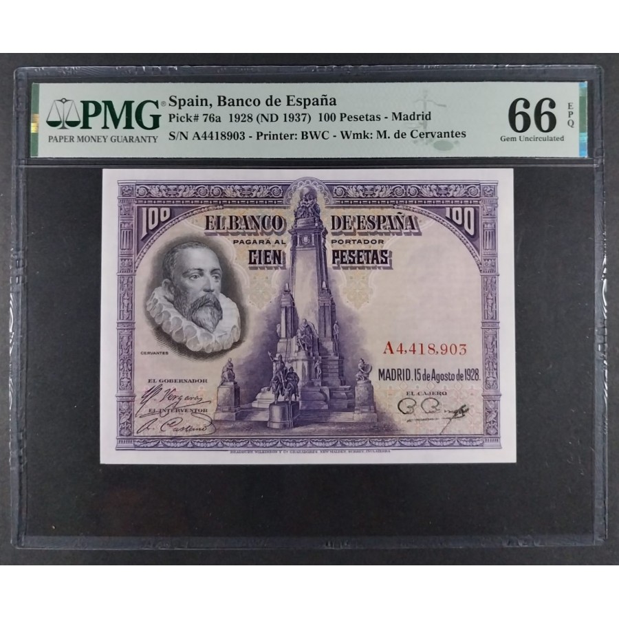 100 PESETAS 1928 SERIE A CERVANTES PMG 66 EPQ SC