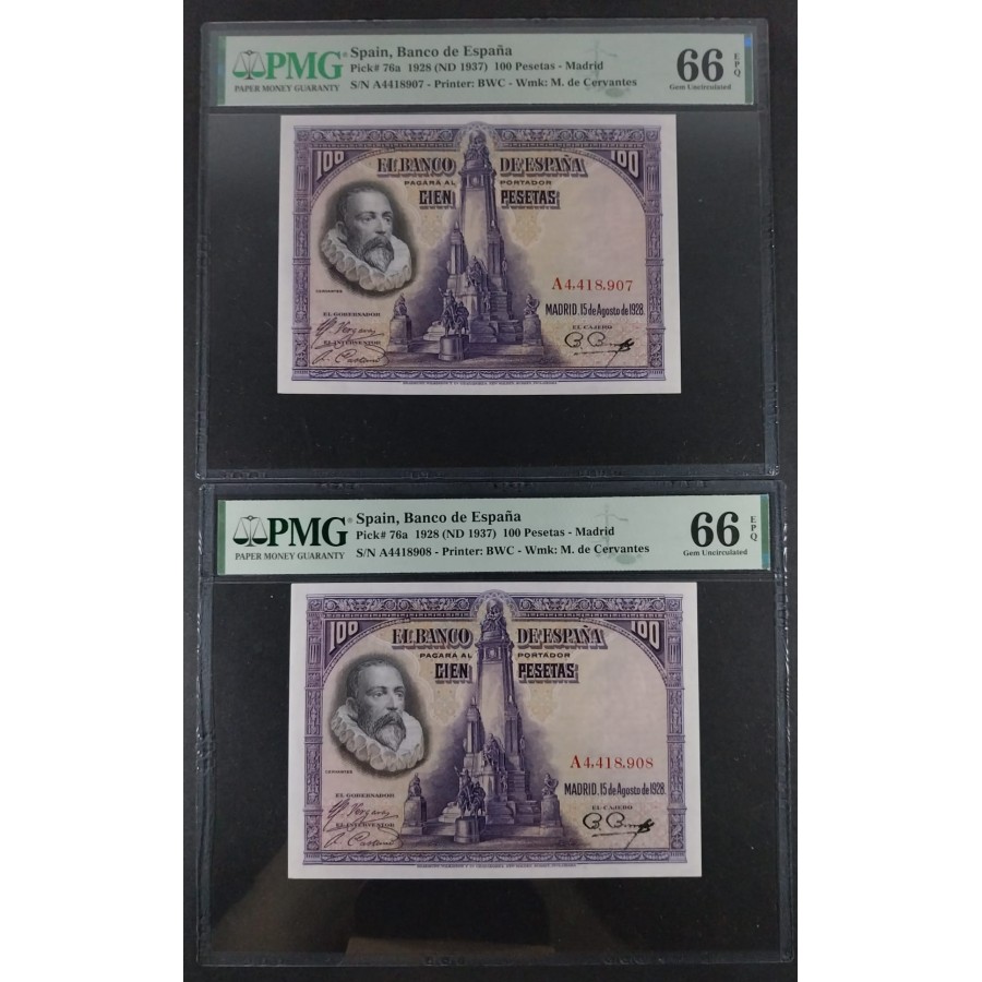 100 PESETAS 1928 SERIE A CERVANTES PAREJA CORRELATIVA PMG 66 EPQ SC