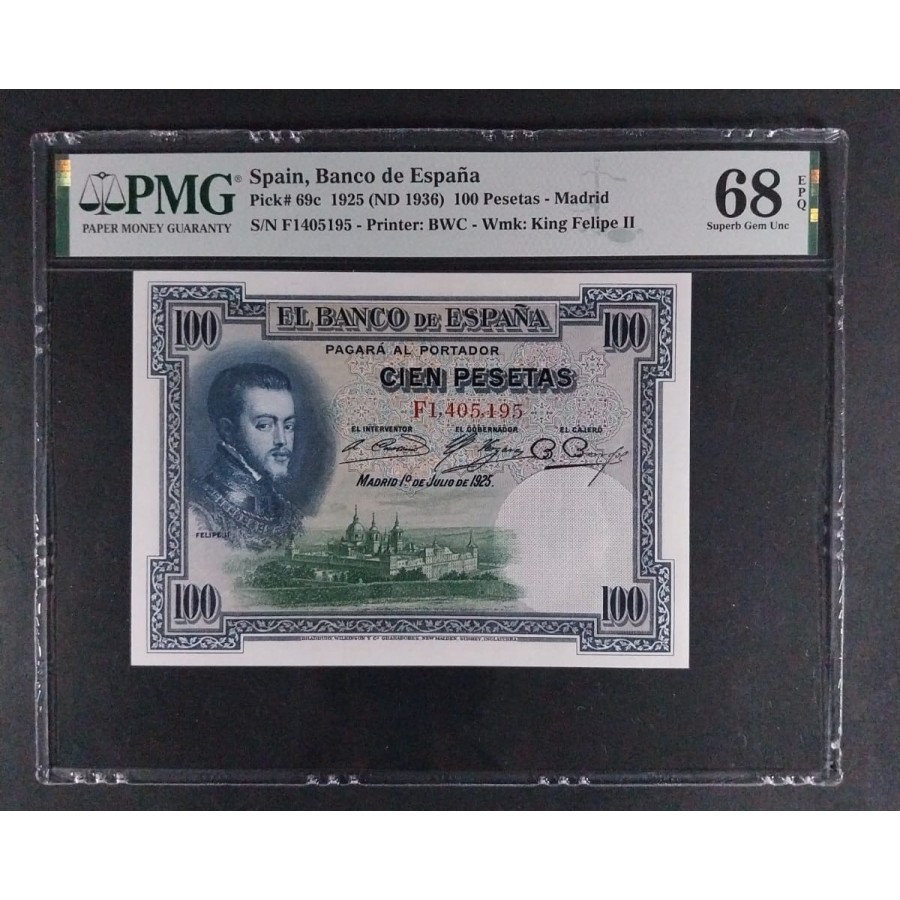 100 PESETAS 1925 FELIPE II PMG 68 EPQ TOP POP SIN CIRCULAR SERIE F