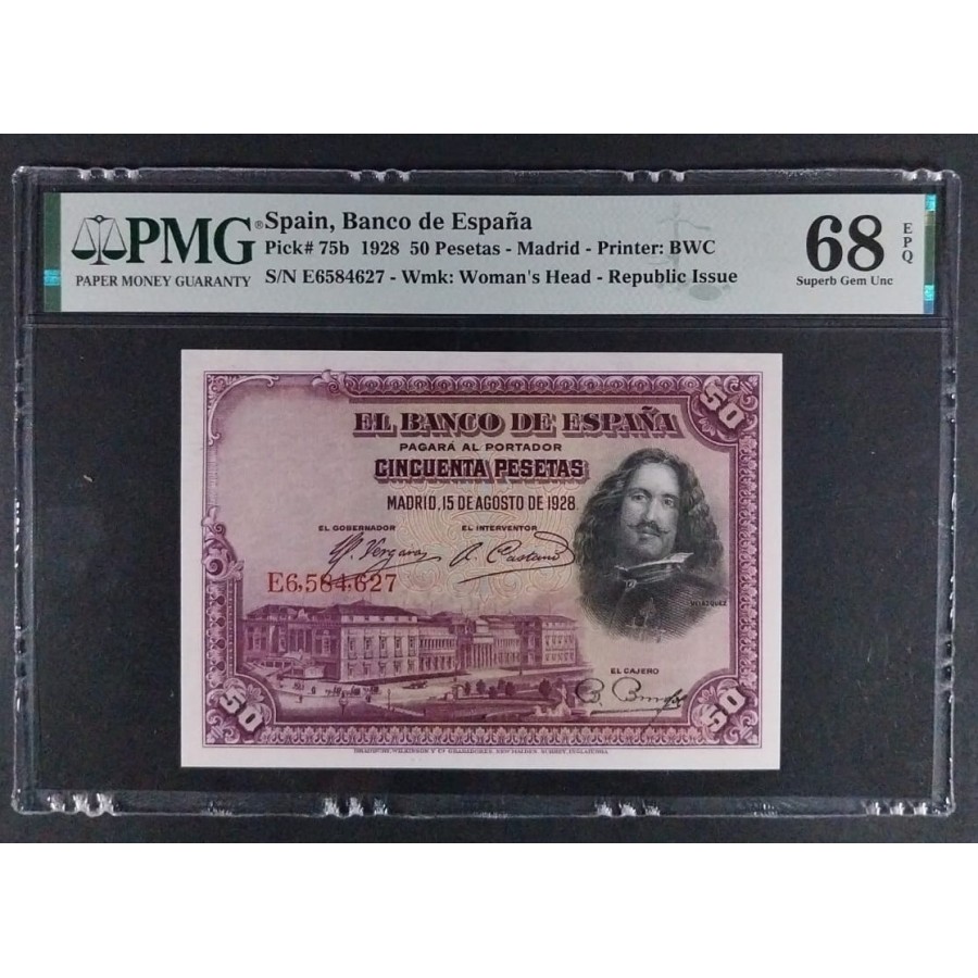 50 PESETAS 1928 VELAZQUEZ PMG 68 EPQ SERIE E CERTIFICADO SIN CIRCULAR