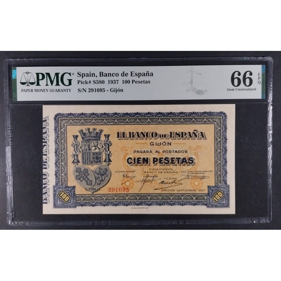 PMG 100 PESETAS GIJÓN 1937 PMG 66 EPQ CERTIFICADO SIN CIRCULAR