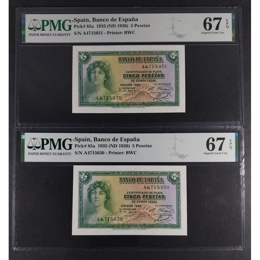 PMG 5 PESETAS 1935 SERIE A PMG 67/67EPQ PAREJA CERTIFICADA