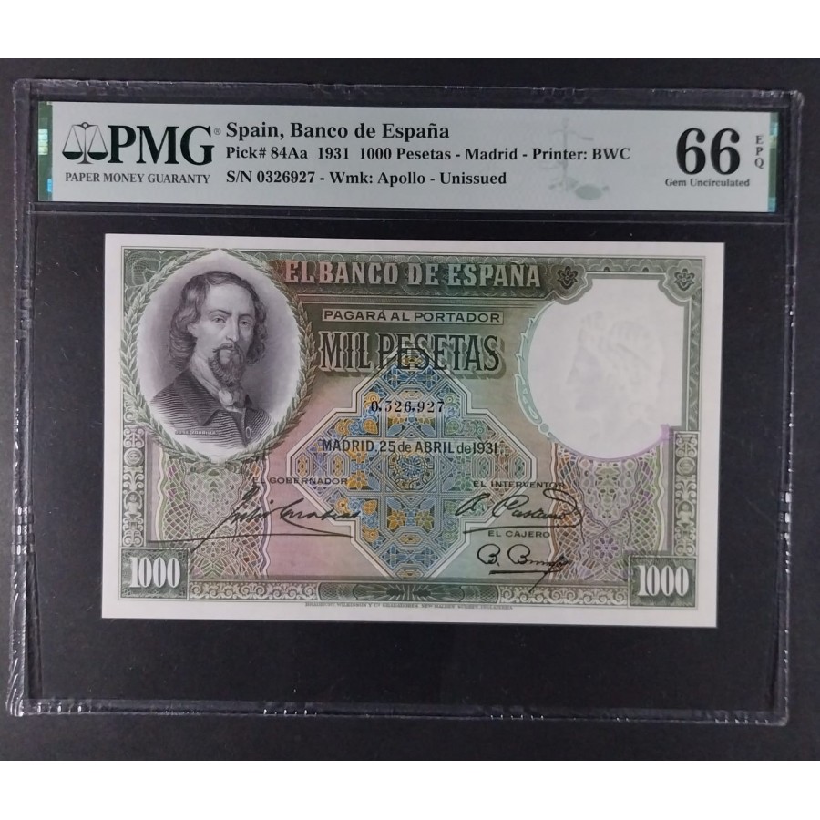 1000 PESETAS 1931 ZORRILLA CERTIFICADO PMG 66 EPQ SIN CIRCULAR