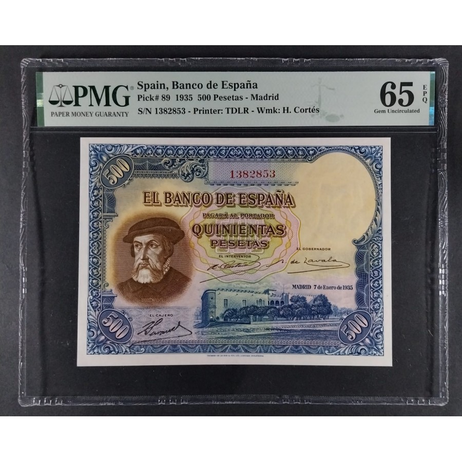 500 PESETAS 1935 HERNÁN CORTÉS PMG 65 EPQ SIN CIRCULAR
