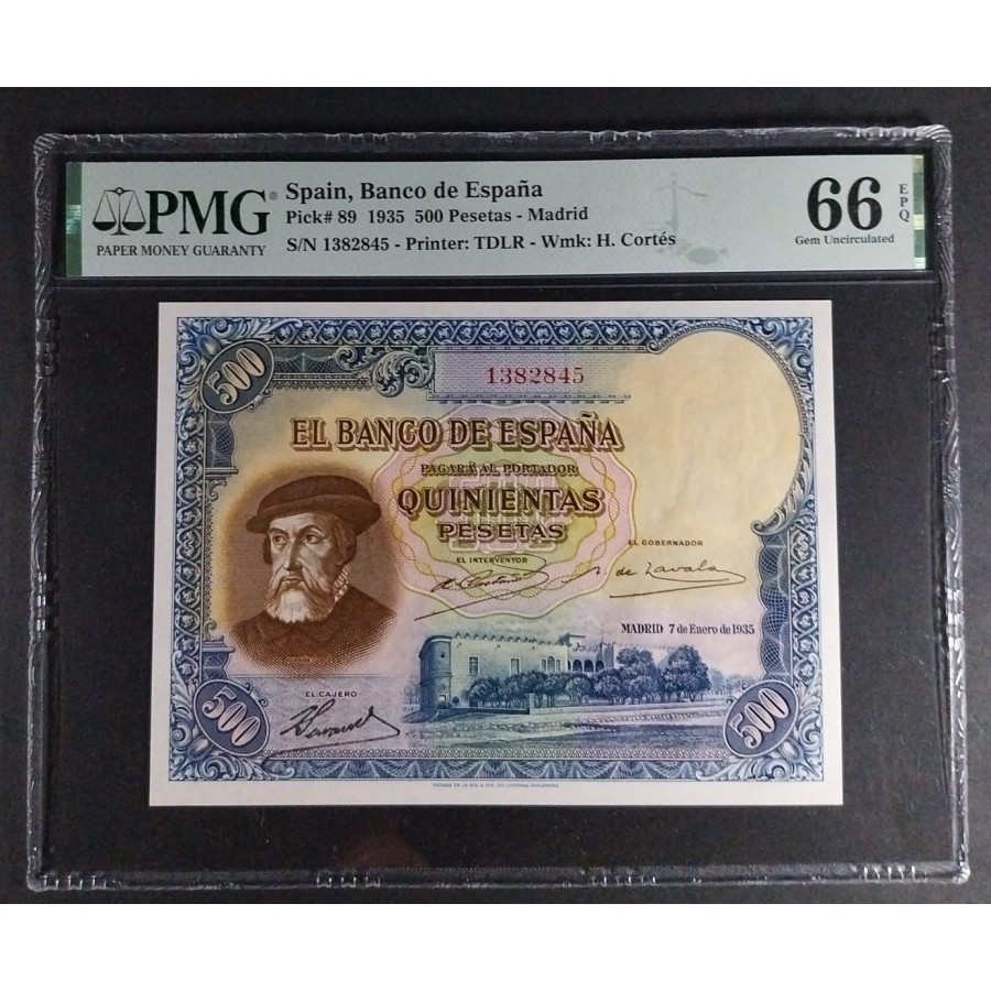 500 PESETAS 1935 HERNÁN CORTÉS PMG 66 EPQ SC
