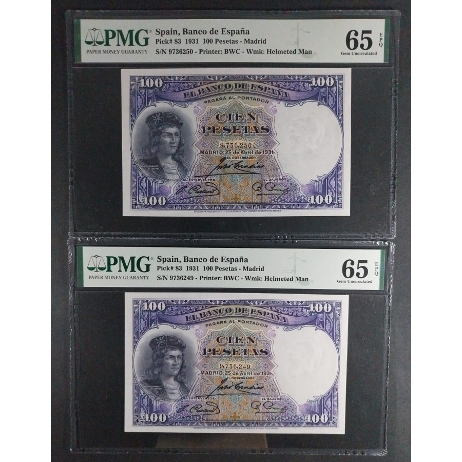 PMG BILLETES 100 PESETAS 1931 CÓRDOBA PAREJA (EL GRAN CAPITÁN) CERTIFICADO PMG 65/65 EPQ SIN CIRCULAR