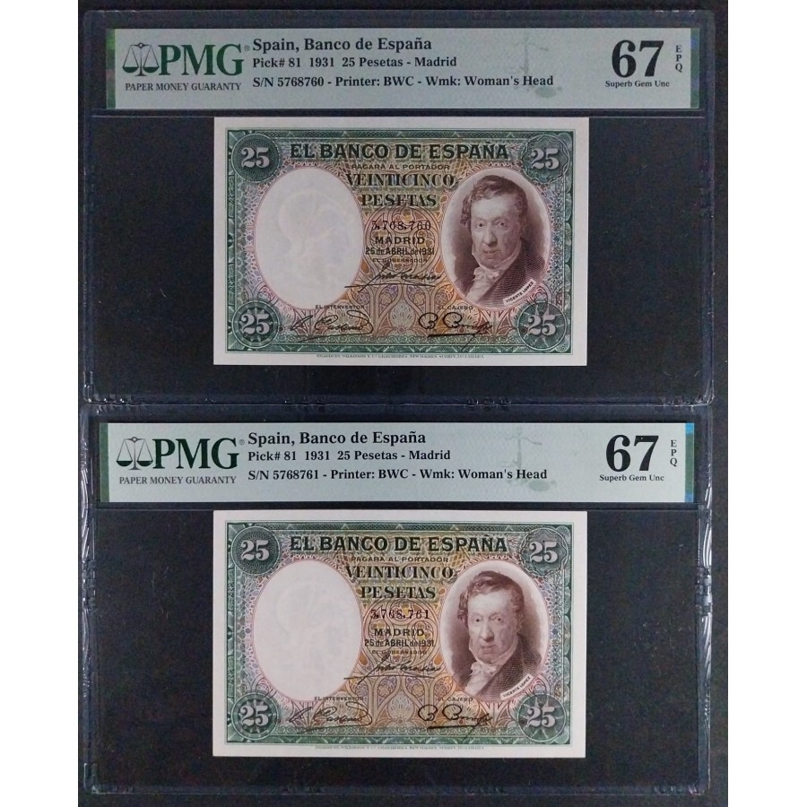 BILLETES DE 25 PESETAS DE 1931, VICENTE LOPEZ - PAREJA- ESTADO PMG. 67/67 E.P.Q