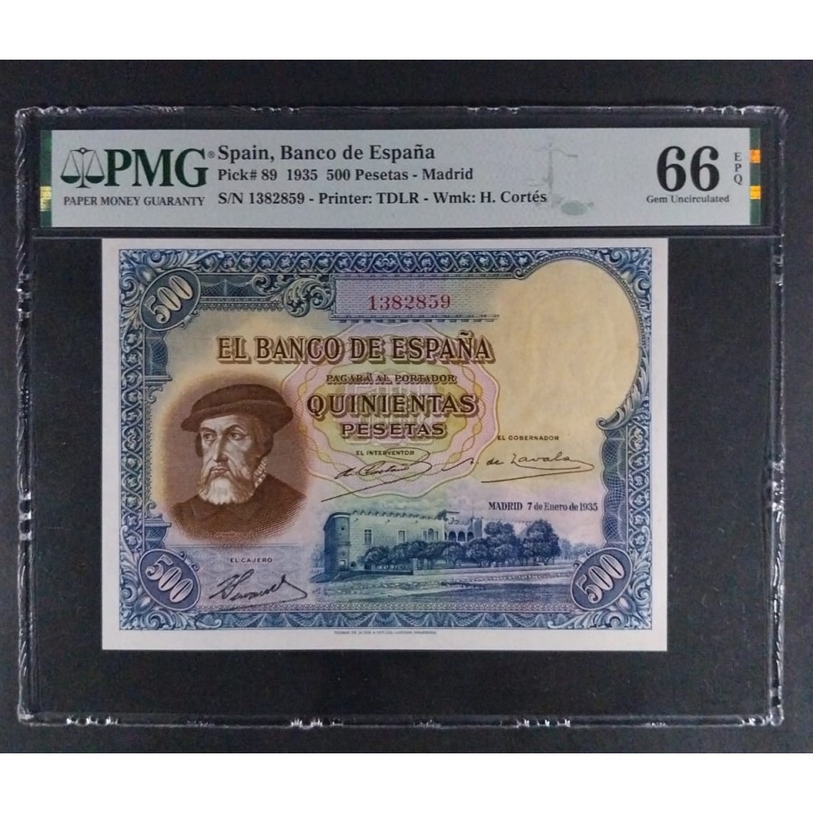 500 PESETAS 1935 HERNÁN CORTÉS PMG 66 EPQ SC