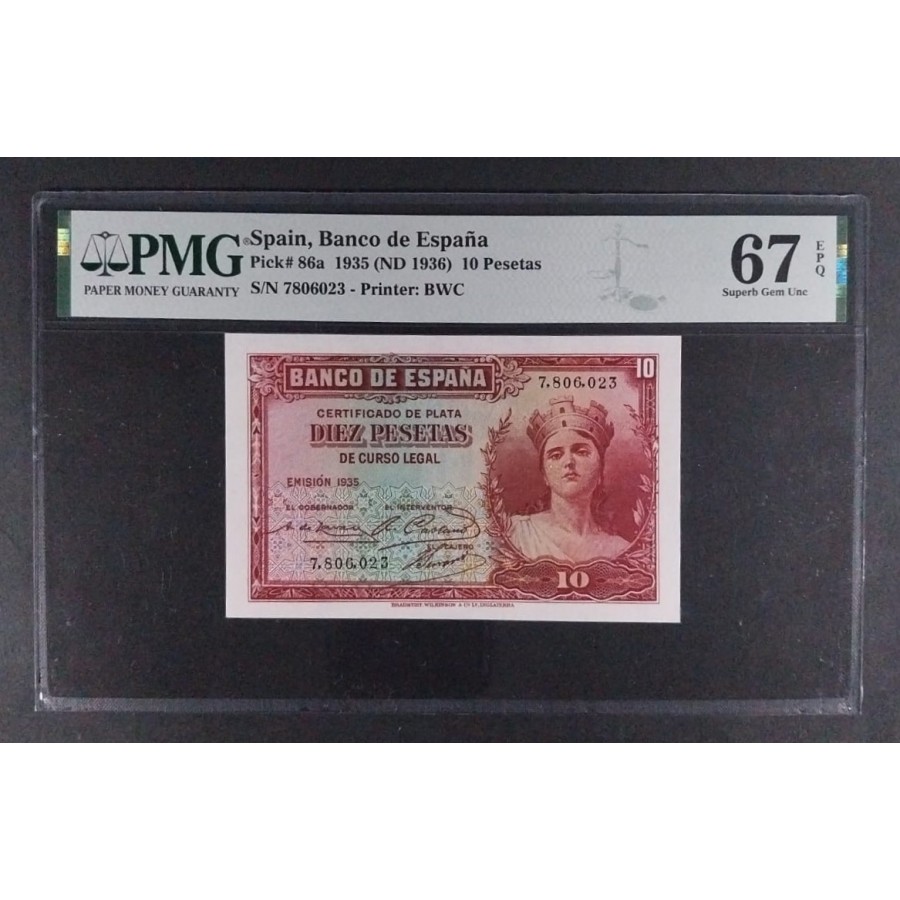 PMG BILLETE DE 10 PESETAS DE 1935 SIN SERIE PMG 67 EPQ SIN CIRCULAR