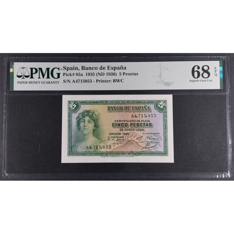 5 PESETAS 1935 SERIE A PMG 68 EPQ TOP POP CERTIFICADA SIN CIRCULAR