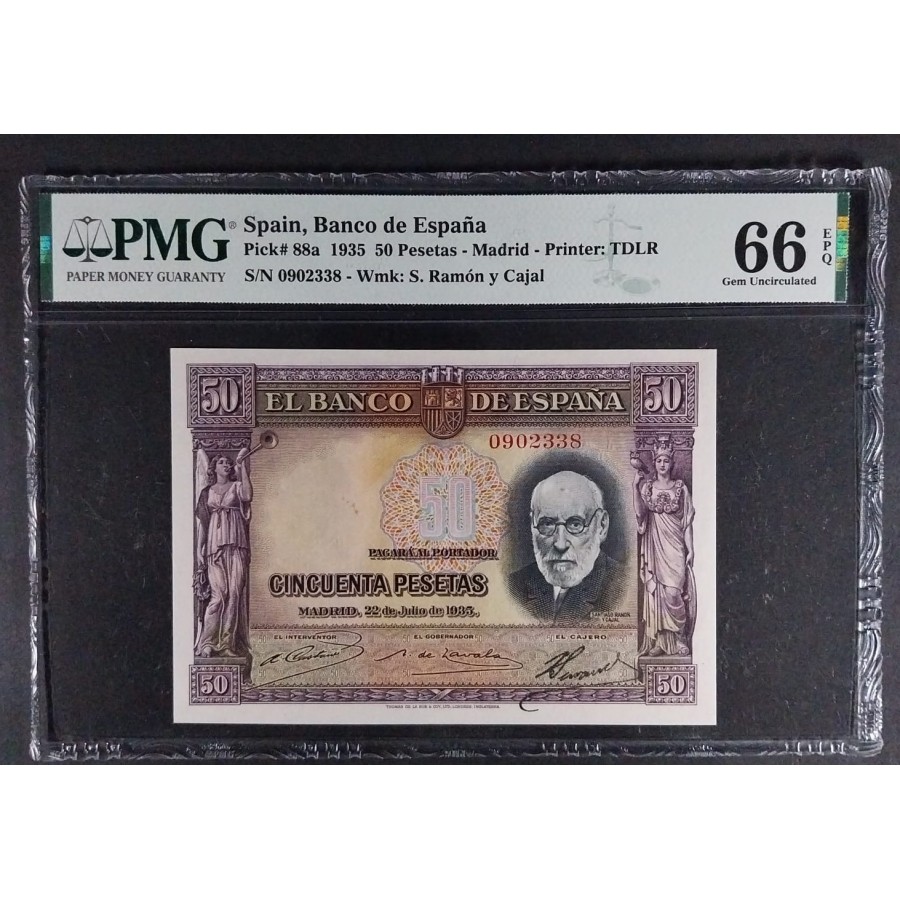 50 PESETAS 1935 CAJAL SIN SERIE PMG 66 EPQ SC