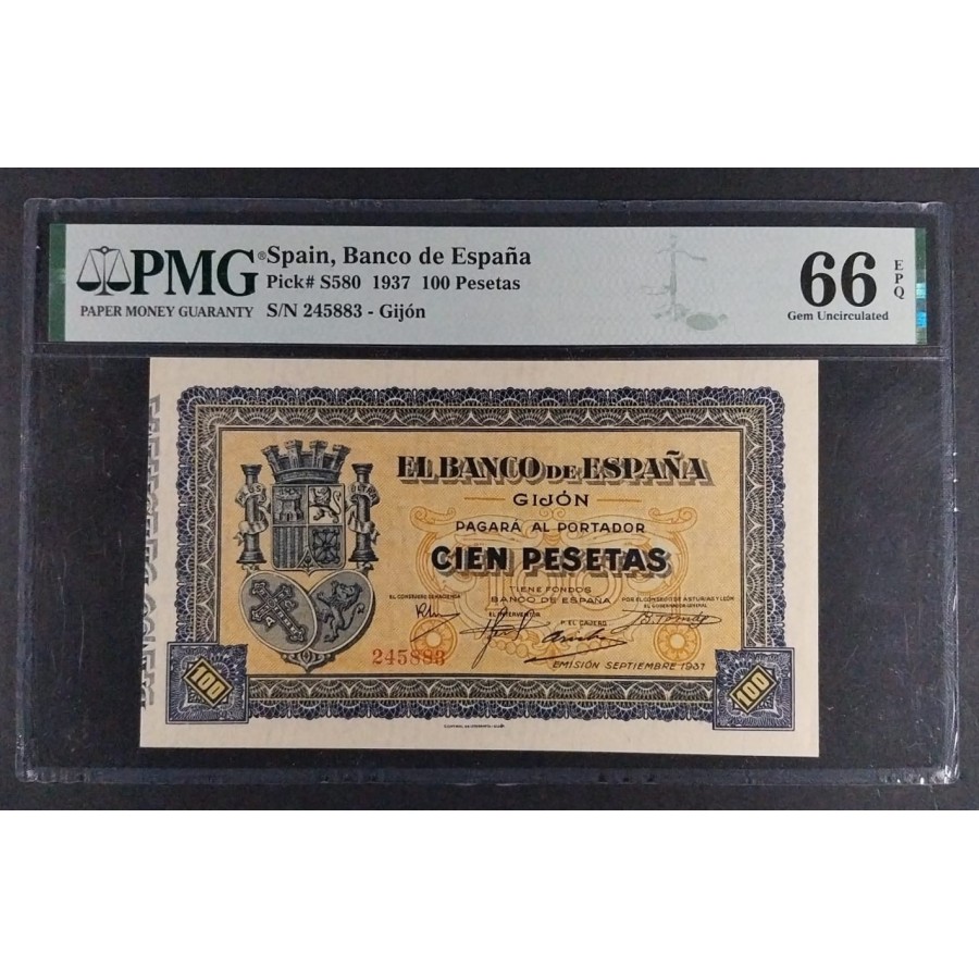 PMG 100 PESETAS GIJÓN 1937 PMG 66 EPQ CERTIFICADO SIN CIRCULAR