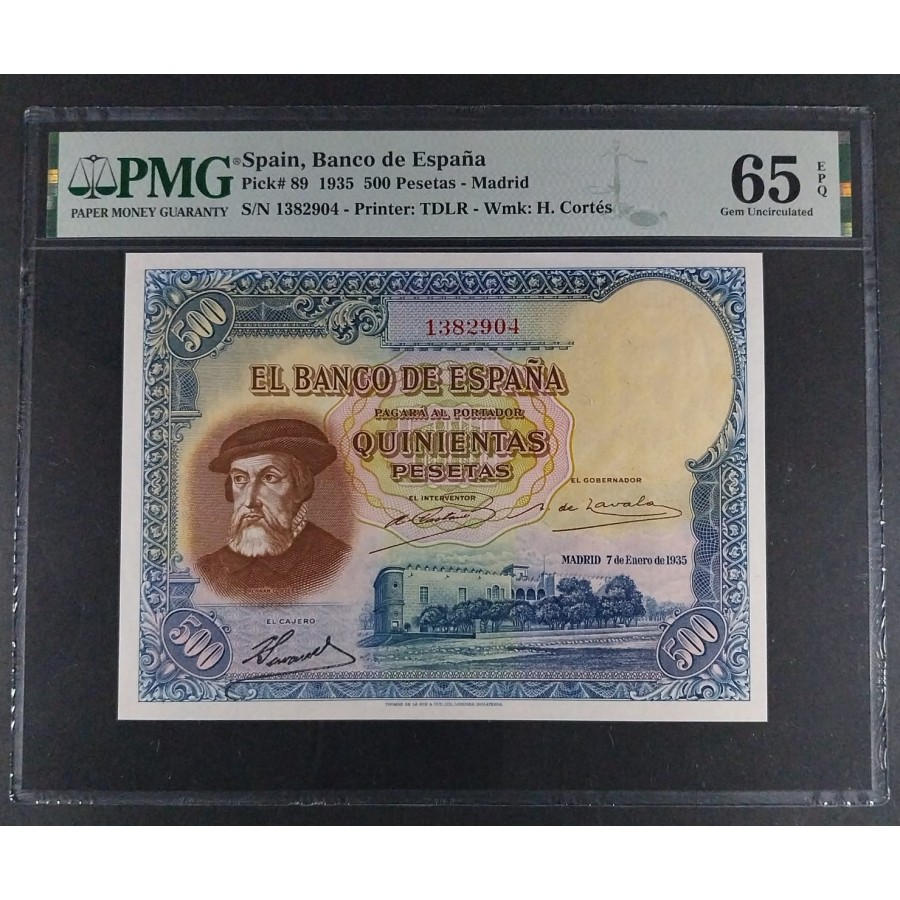 500 PESETAS 1935 HERNÁN CORTÉS PMG 65 EPQ SIN CIRCULAR