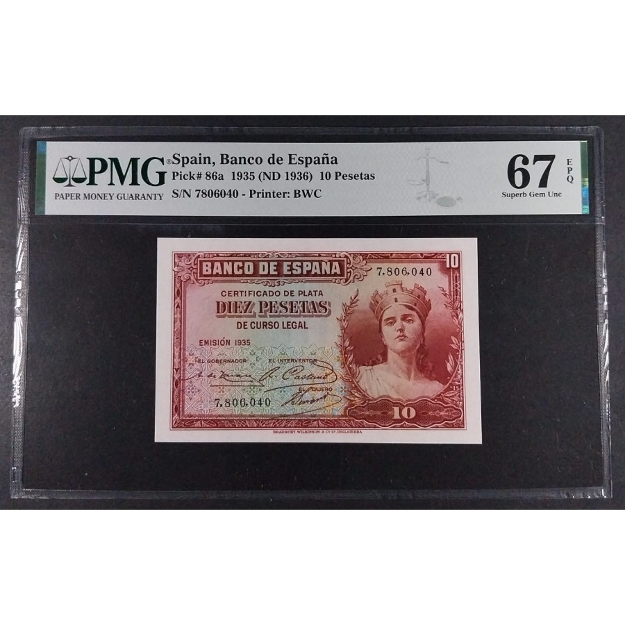 PMG BILLETE DE 10 PESETAS DE 1935 SIN SERIE PMG 67 EPQ SIN CIRCULAR