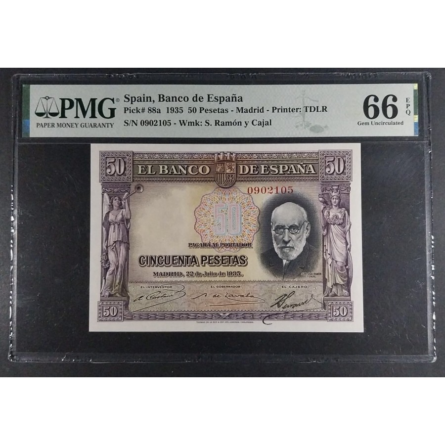 50 PESETAS 1935 CAJAL SIN SERIE PMG 66 EPQ SC