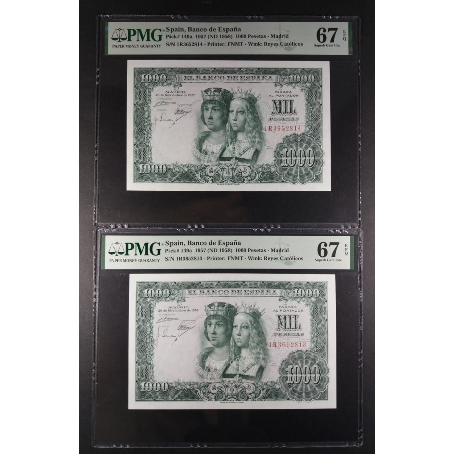 1000 PESETAS 1957 REYES CATÓLICOS SERIE 1R PMG 67/67 EPQ PAREJA CORRELATIVA SIN CIRCULAR CERTIFICADO