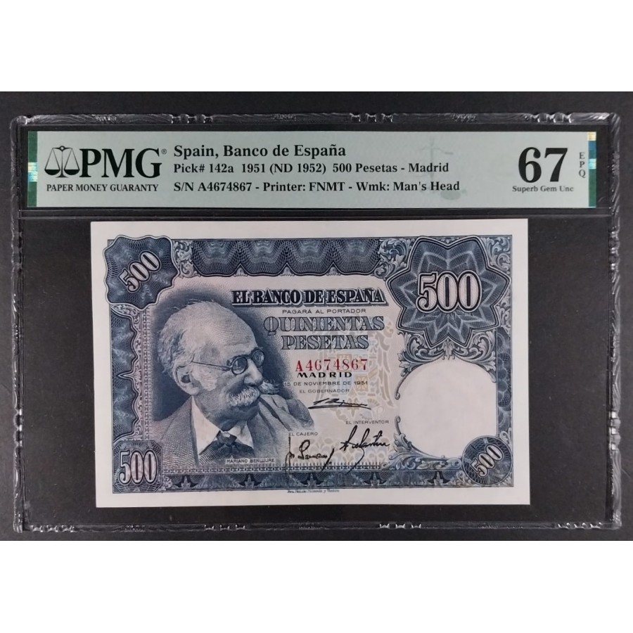 500 PESETAS 1951 BENLLIURE SERIE A PMG 67 EPQ SC