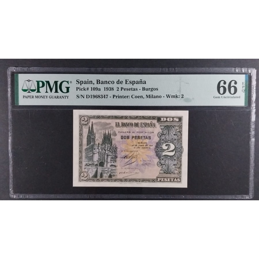 BILLETE 2 PESETAS 1938 SERIE D PMG 66 EPQ SC