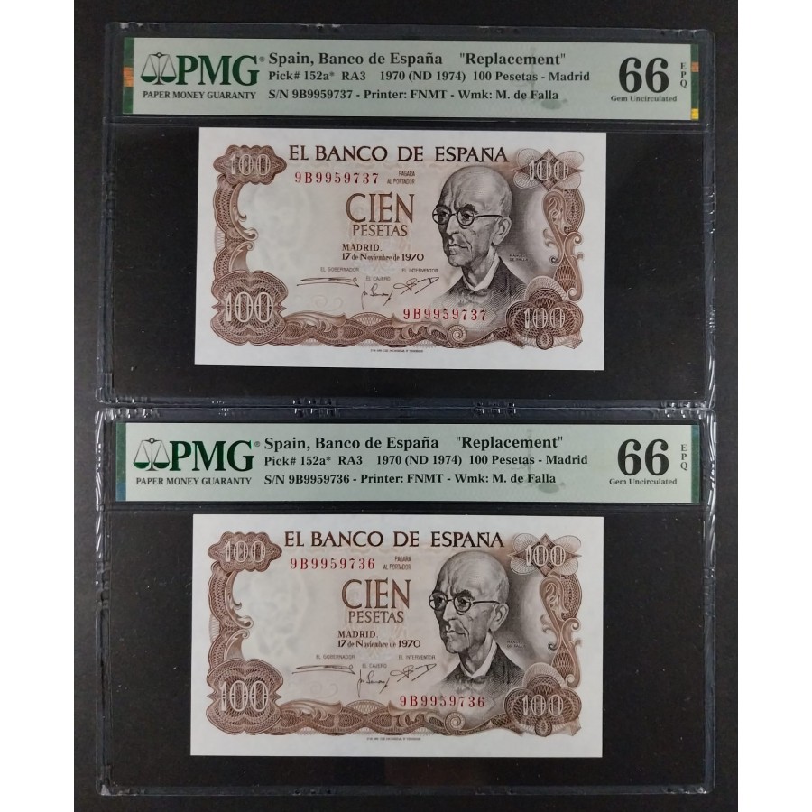 100 PESETAS 1970 FALLA SERIE 9B (Serie de sustitución) PMG 66 EPQ PAREJA CORRELATIVA