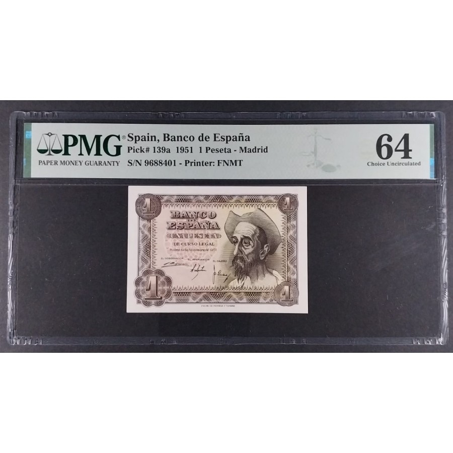 Pick# 139a 1 PESETA 1951 BANCO DE ESPAÑA - MADRID. Sin serie. QUIJOTE. PMG 64
