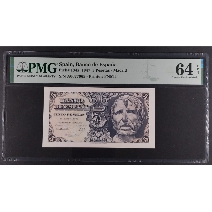 5 PESETAS 1947 SERIE A SENECA PMG EPQ 64 SC