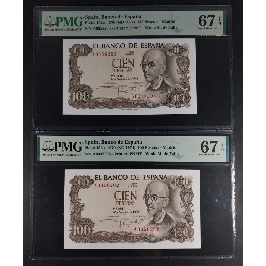 100 PESETAS 1970 SERIE A PMG 67 EPQ FALLA PAREJA CORRELATIVA SC