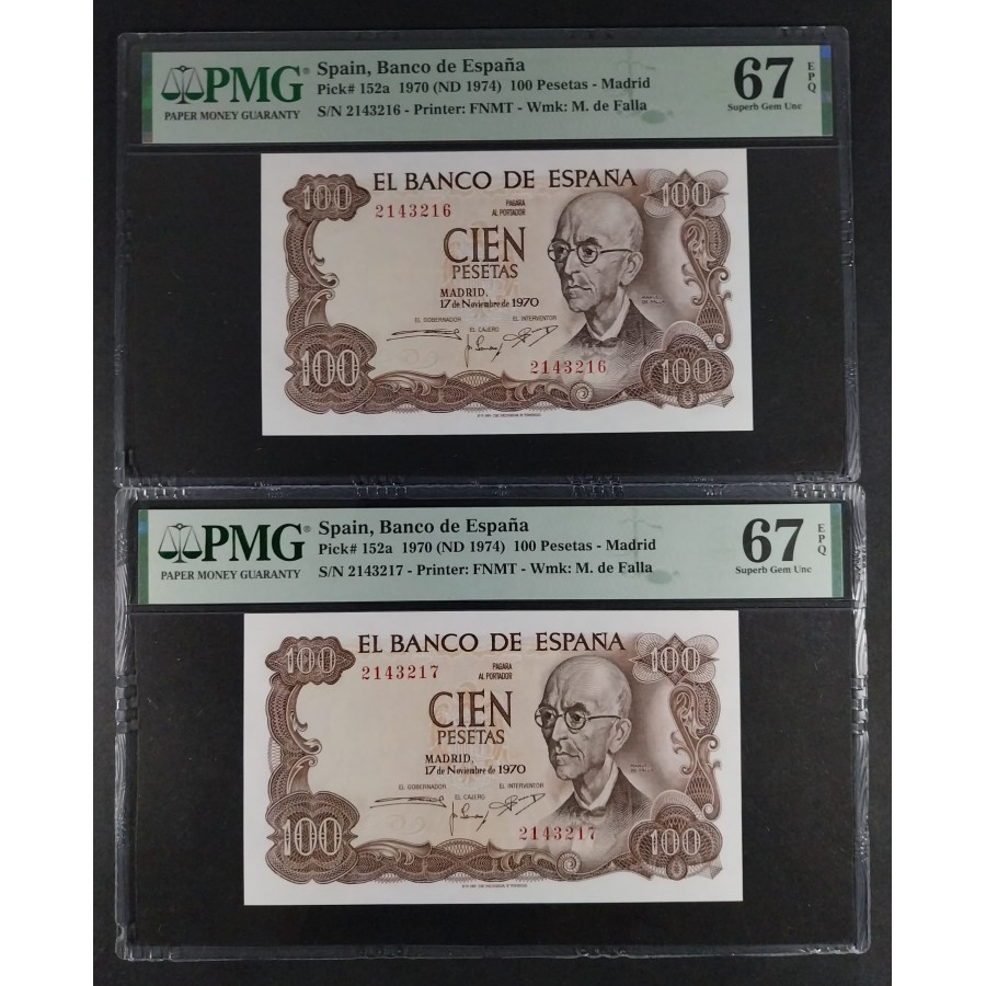 100 PESETAS 1970 SIN SERIE PMG 67/67 EPQ PAREJA CORRELATIVA