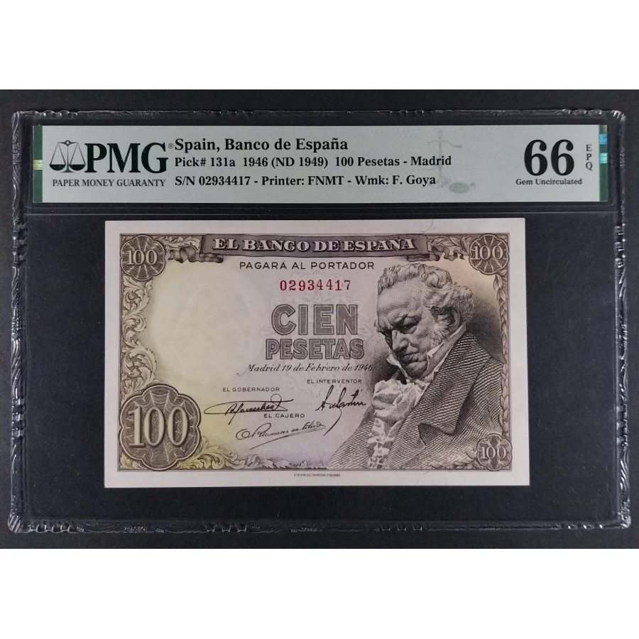 100 PESETAS DE 1946 GOYA SIN SERIE PMG 66 EPQ CERTIFICADO SIN CIRCULAR