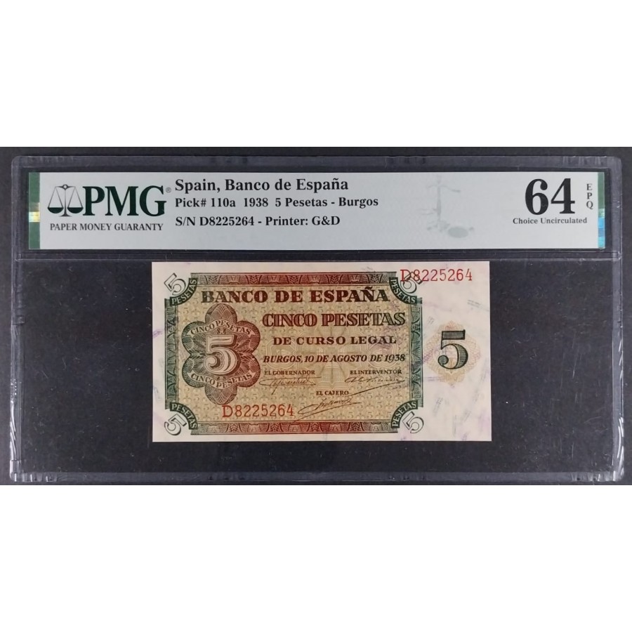 5 PESETAS 1938 SERIE D PMG 64 EPQ SC CERTIFICADO
