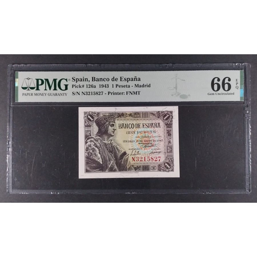 1 PESETAS 1943 (REY CATÓLICO) SERIE N (ÚLTIMA SERIE EMITIDA) PMG 66 EPQ SC