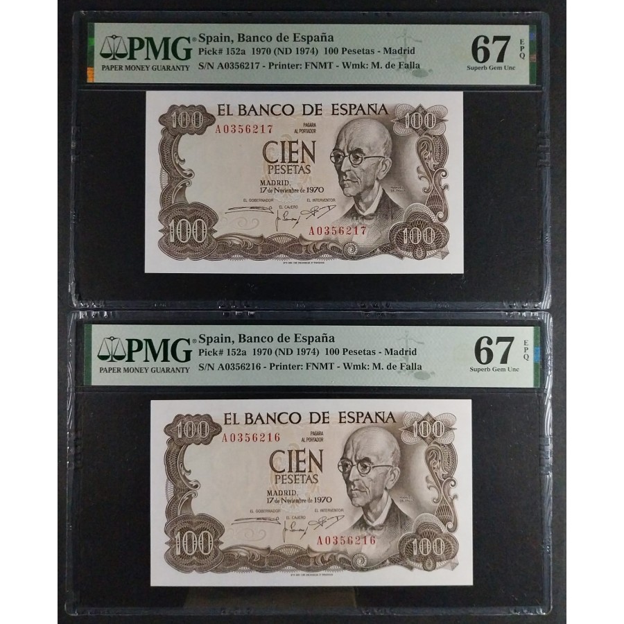 100 PESETAS 1970 SERIE A PMG 67 EPQ FALLA PAREJA CORRELATIVA SC