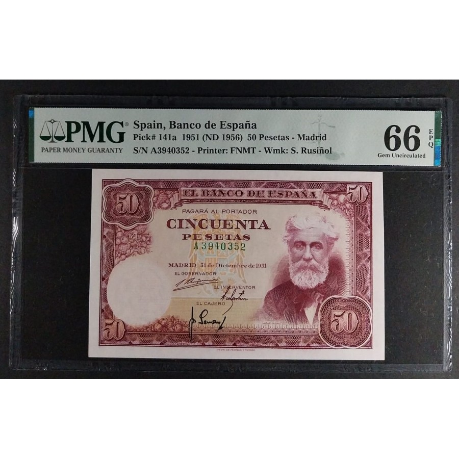 50 PESETAS 1951 SERIE A RUSINOL PMG 66 EPQ SC