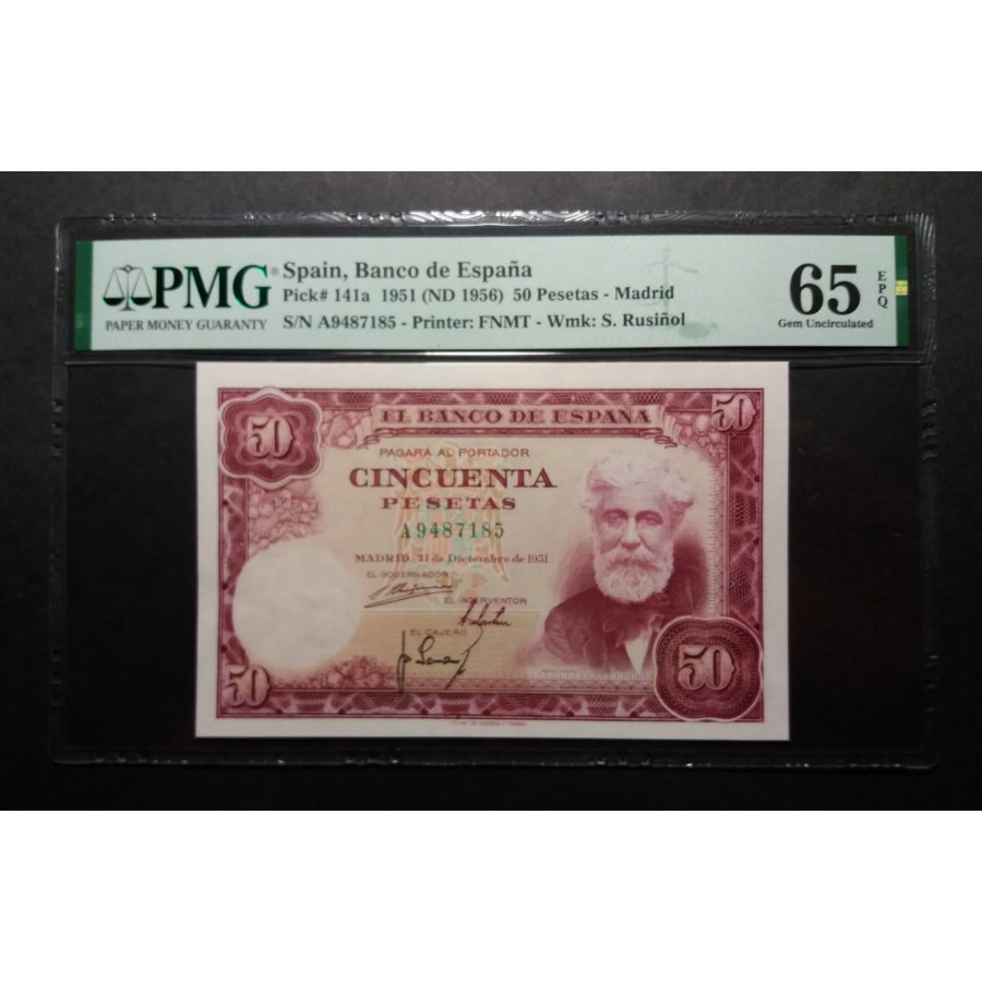 PMG BILLETE DE 50 PESETAS DE 1951 RUSIÑOL SERIE A PMG 65 EPQ SIN CIRCULAR