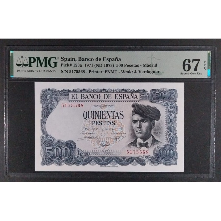 500 PESETAS 1971 VERDAGUER SIN SERIE PMG 67 EPQ CERTIFICADO SIN CIRCULAR