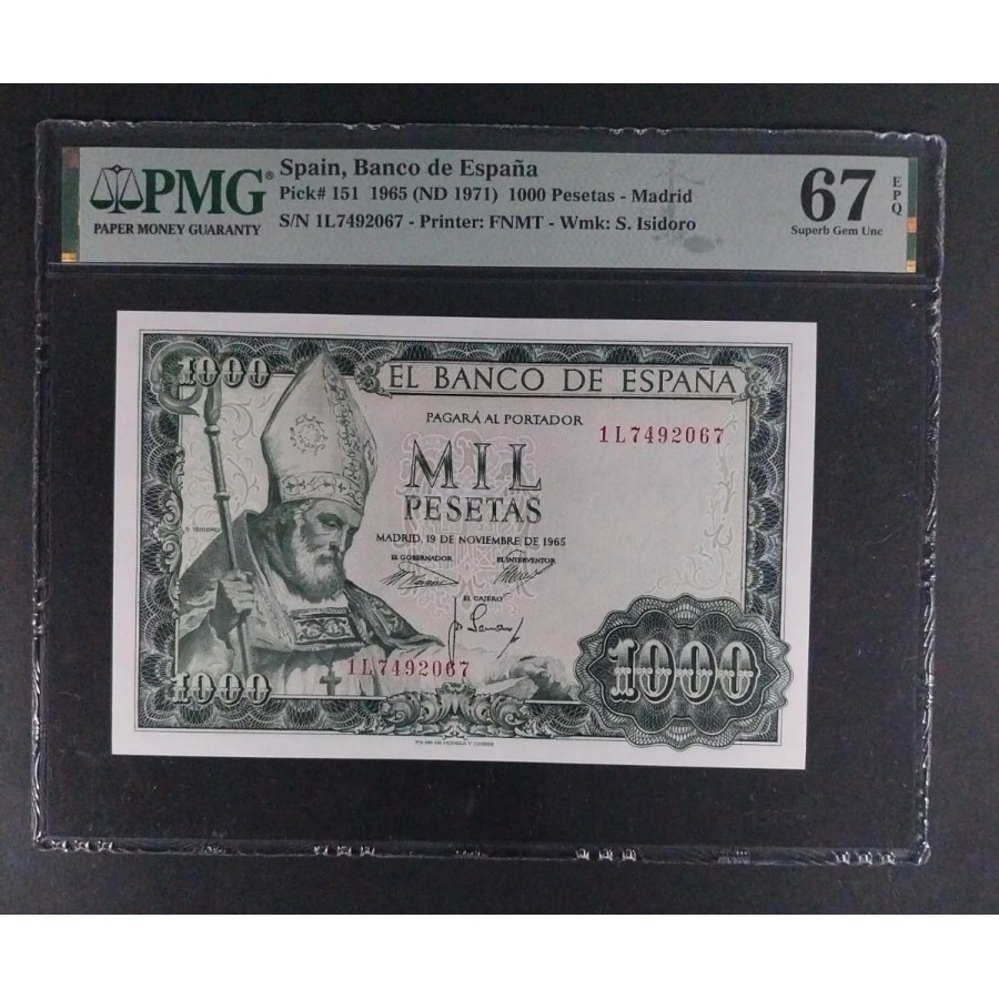 1000 PESETAS 1965 OBISPO SAN ISIDORO 1B PMG 67 EPQ SC