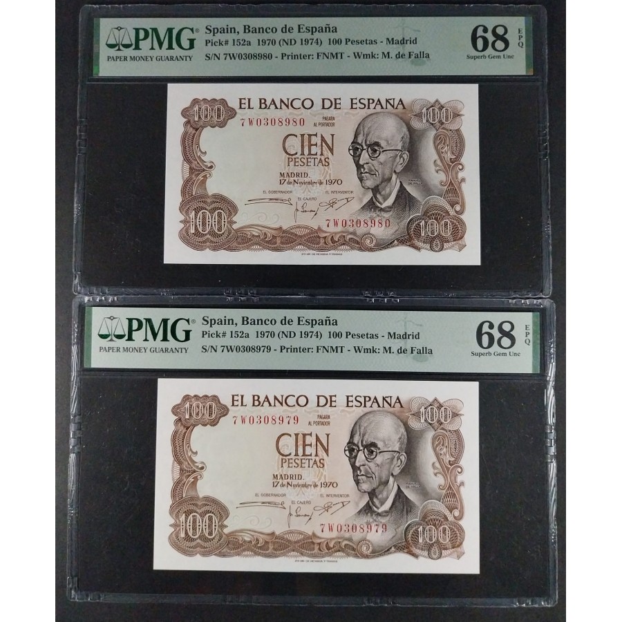 100 PESETAS 1970 SERIE 7W (última emitida) PMG 68/68 EPQ FALLA PAREJA CORRELATIVA SC
