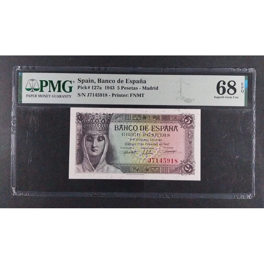 5 PESETAS 1943 SERIE J ÚLTIMA SERIE REINA CATÓLICA PMG 68 EPQ POP TOP
