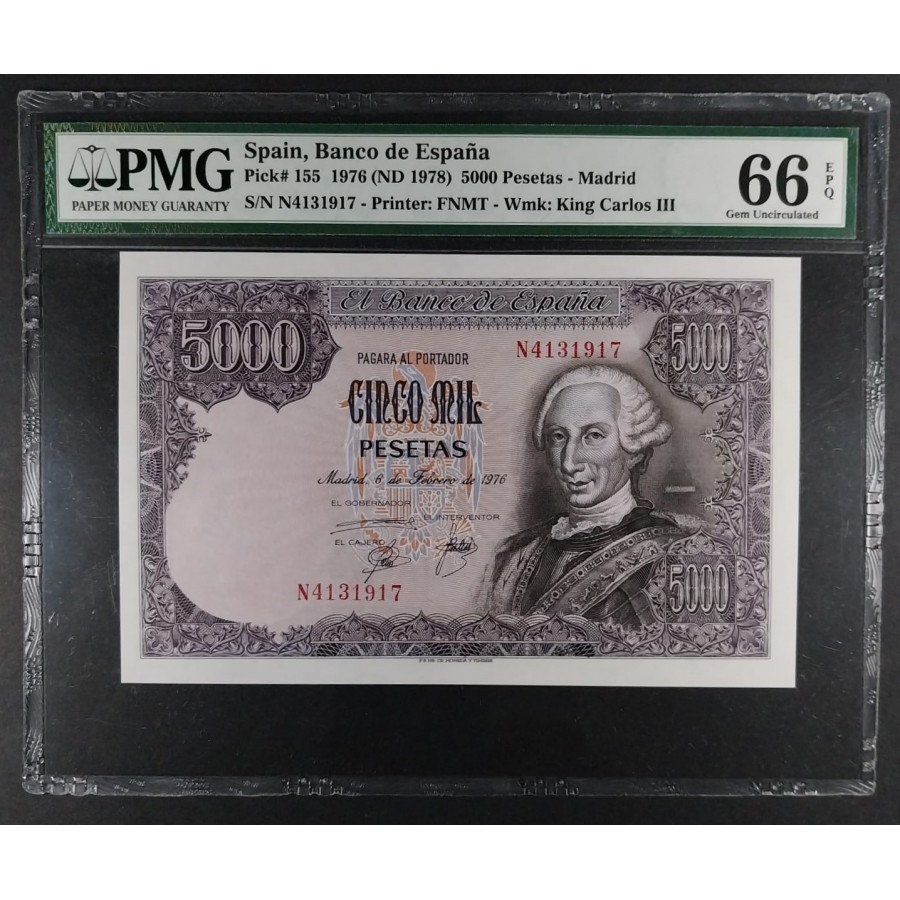 5000 PESETAS 1976 SERIE N CARLOS III PMG 66 EPQ
