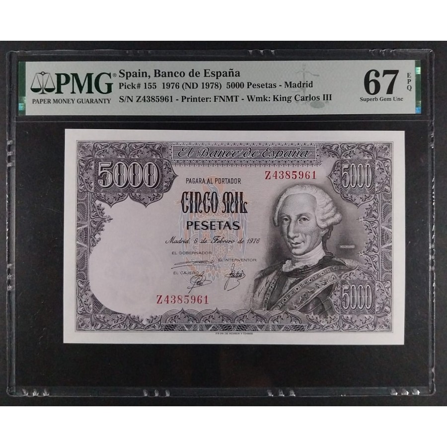 5000 PESETAS 1976 SERIE Z CARLOS III PMG 67 EPQ
