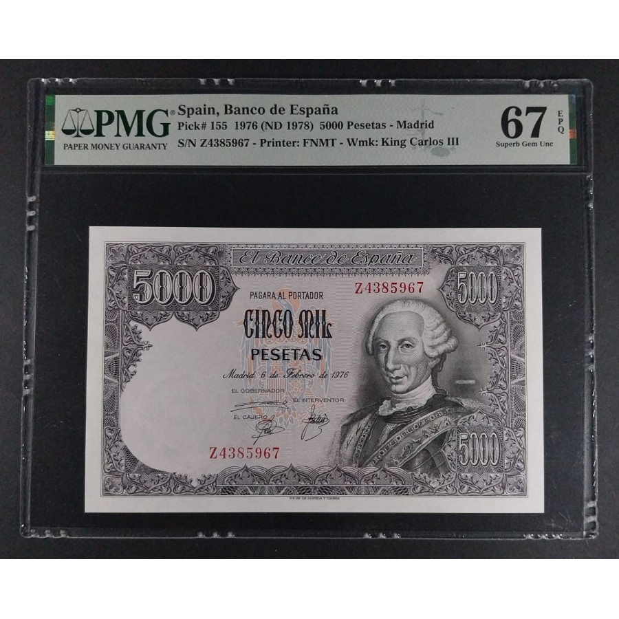 5000 PESETAS 1976 SERIE Z CARLOS III PMG 67 EPQ