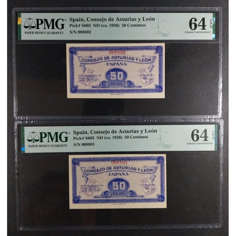 50 CENTIMOS 1937 CONSEJO DE ASTURIAS Y LEÓN PAREJA CORRELATIVA PMG 64 EPQ SC