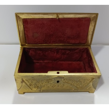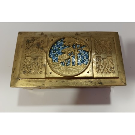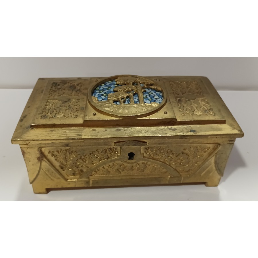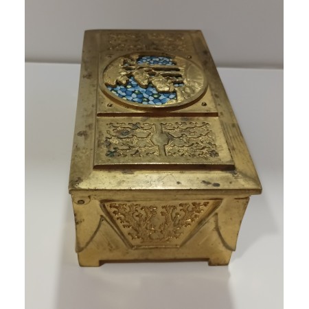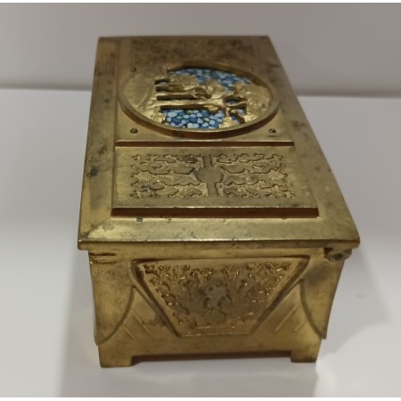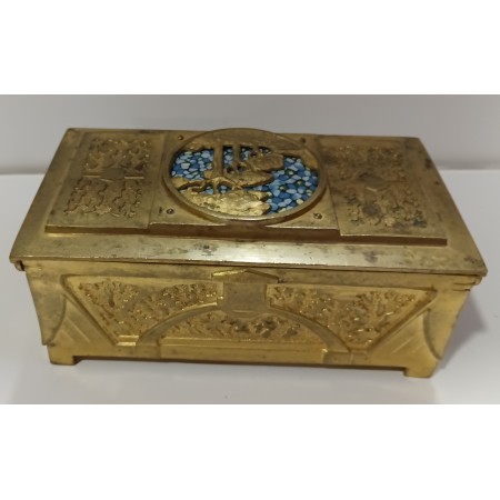 COFRE JOYERO BRONCE CINCELADO DORADO AL MERCURIO CON PORCELANA. SIGLO XIX. ESCENAS CON RELIEVE